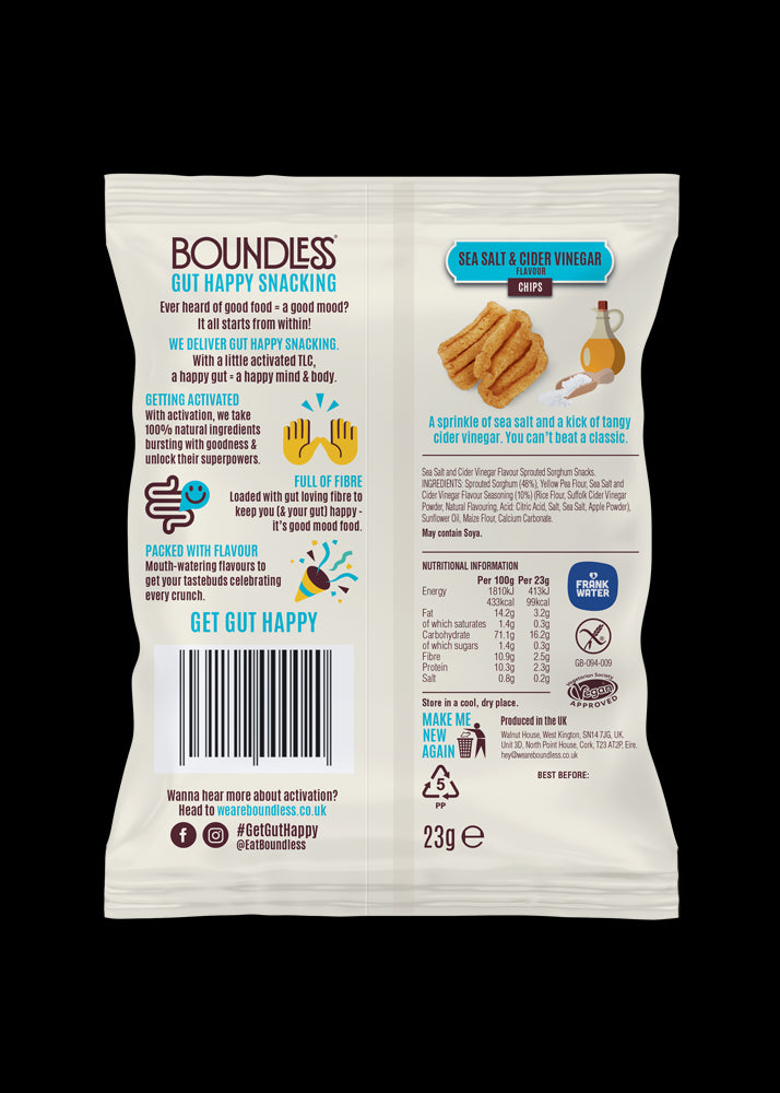 Sprouted Sorghum (48%), Yellow Pea Flour, Sea Salt & Cider Vinegar Flavour Seasoning (10%) (Rice Flour, Suffolk Cider Vinegar Powder, Natural Flavouring, Acid: Citric Acid, Salt, Sea Salt, Apple Powder), Sunflower Oil, Maize Flour, Calcium Carbonate